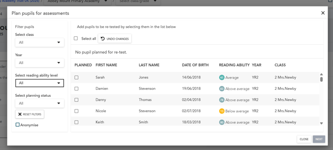 All students are always available in the Test application, but their reading level is not visible there. To simplify reassessment, you can pre-plan the students you want to re-assess. These students will then appear at the top of each class list in the Test application.