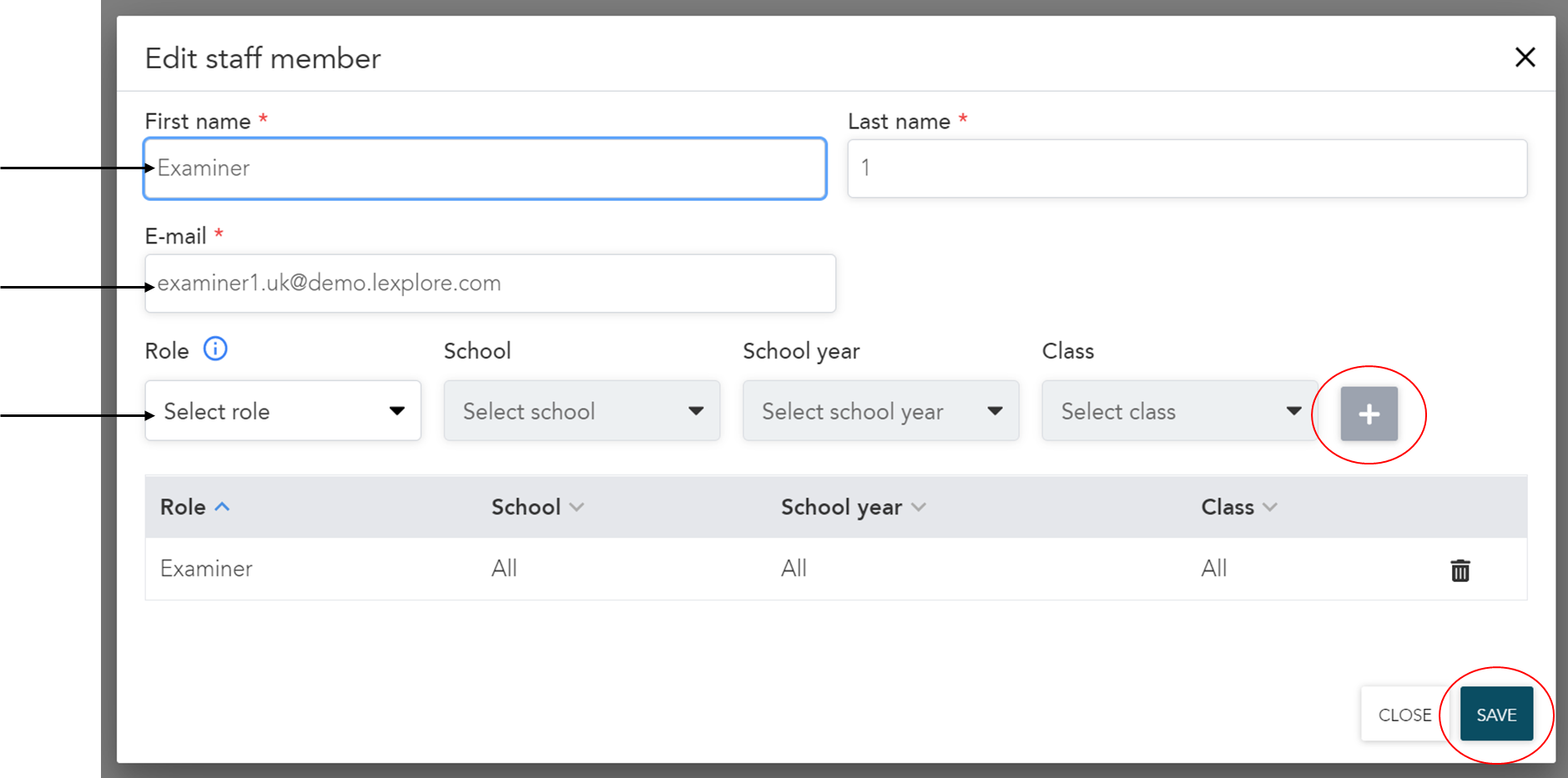 - Add or edit roles. Remember to click the "+"-icon when you wish to add a new role to the user.