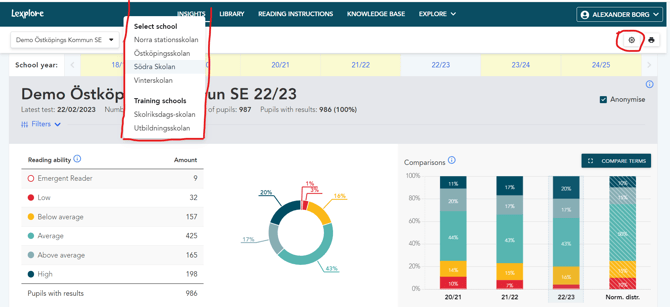 Insights (Only necessary if you are a member of many schools within one municipality or Academy Trust). - Click on the cog that will appear in the upper right corner once filtered down to the school level.