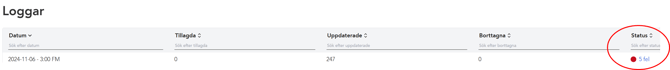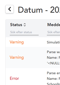 När ni klickar på statusen kommer en mer detaljerad vy över alla rader. Ni kan sortera på error eller varningar genom att klicka på rubriken "Status".