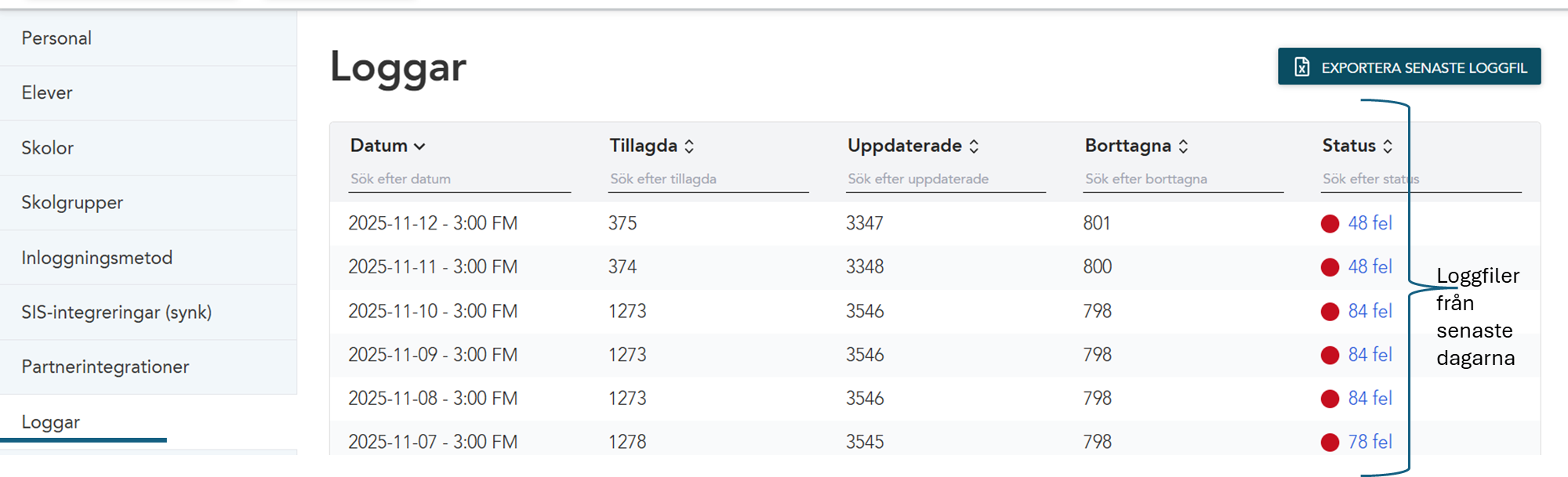 Om synken mellan källdatasystemet och Skolon inte importerar de elever som ni förväntar er till Lexplore kan man se orsaken bakom misslyckad import i er organisations synk-logg i Lexploreportalen.