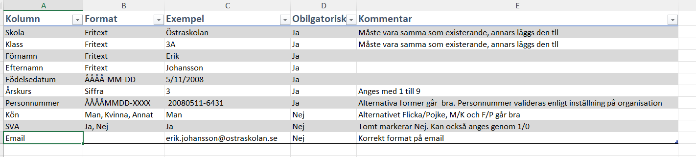 När du laddat ned Excelmallen och ska fylla den med elevinformation ska du ha de här punkterna i åtanke: